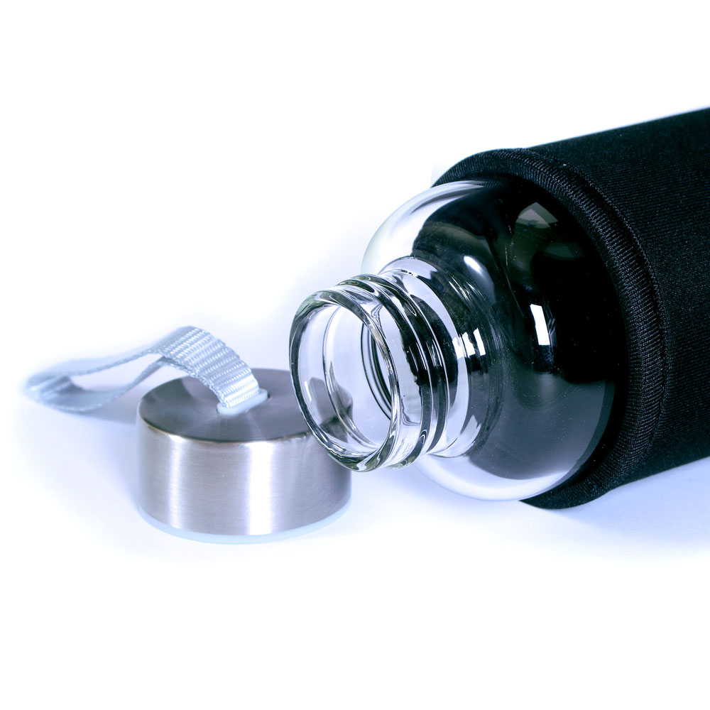 AUSLAUFSICHERE Wasser Trinkflasche: Die plastikfreie und dadurch umweltfreundliche Borosilikat Glastrinkflasche ist dank unserem hochwertigen Schraubverschluss System 100% dicht.