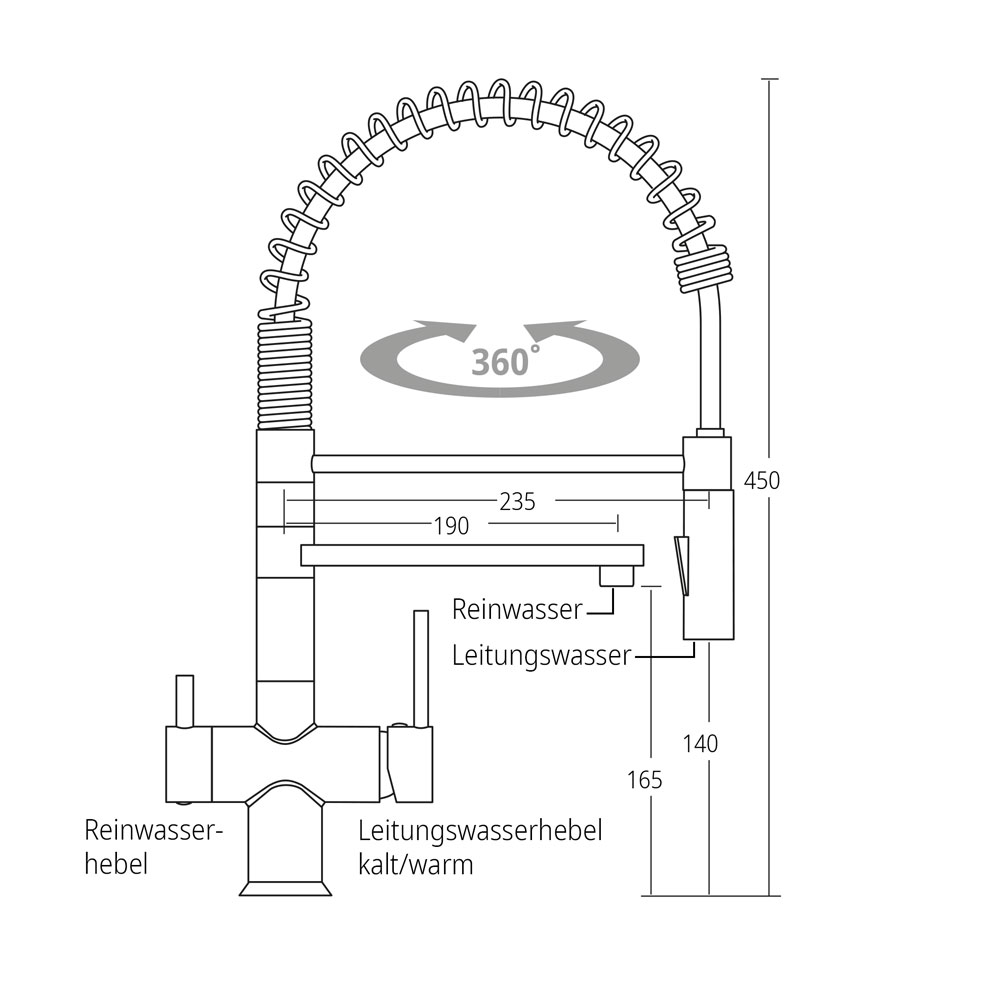 - Auslauf für gefiltertes Reinwasser um volle 360 Grad schwenkbar